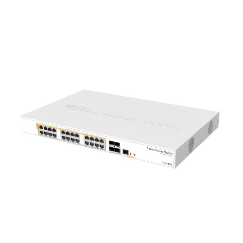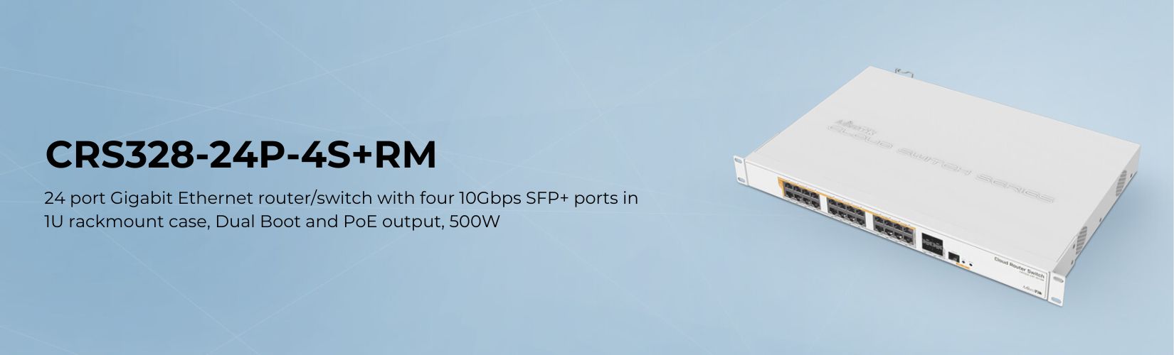 CRS328-24P-4S+RM is a 28 independent port switch, it has 24 Gigabit Ethernet ports, which offer different power output options: Passive PoE, low voltage PoE, 802.3af/at (Type 1 “PoE” / Type 2 “PoE+”) with auto-sensing. PoE-Out is passed over mode B pins (4,5+)(7,8-). The four SFP+ ports provide up to 10 Gbps connectivity options via either optical fiber or Ethernet modules (not included).