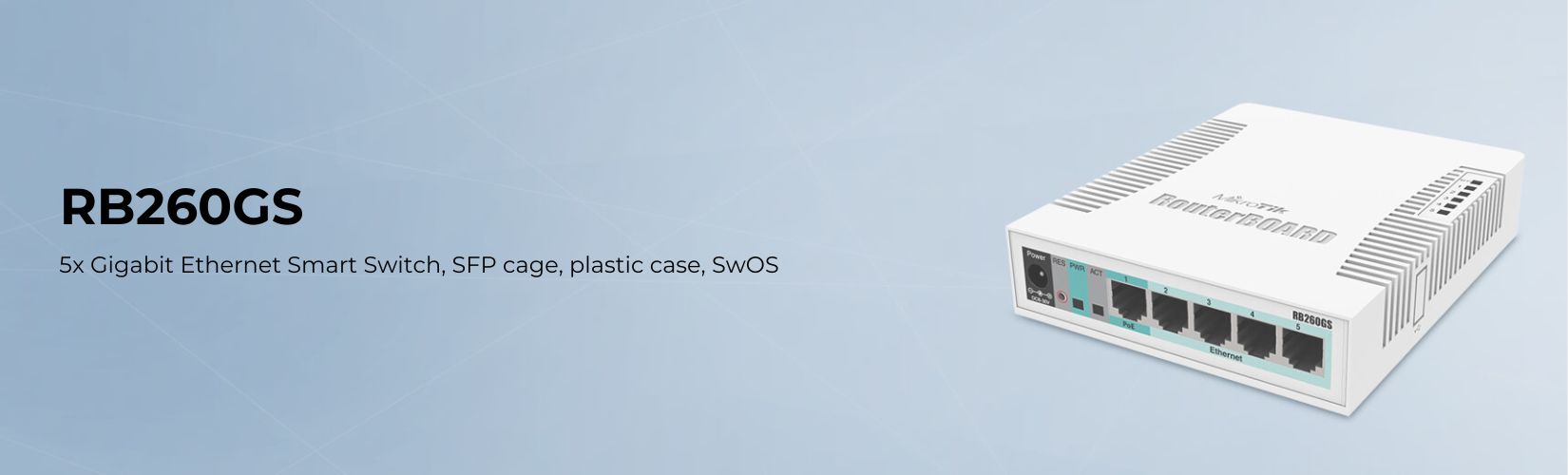 The RB260GS is a small SOHO switch. It has five Gigabit Ethernet ports and one SFP cage powered by an Atheros Switch Chip. Tested and recommended to use with MikroTik SFP modules: S-85DLC05D, S-31DLC20D and S-35/53LC20D (not included) It is powered by an operating system designed specifically for MikroTik Switch products – SwOS.