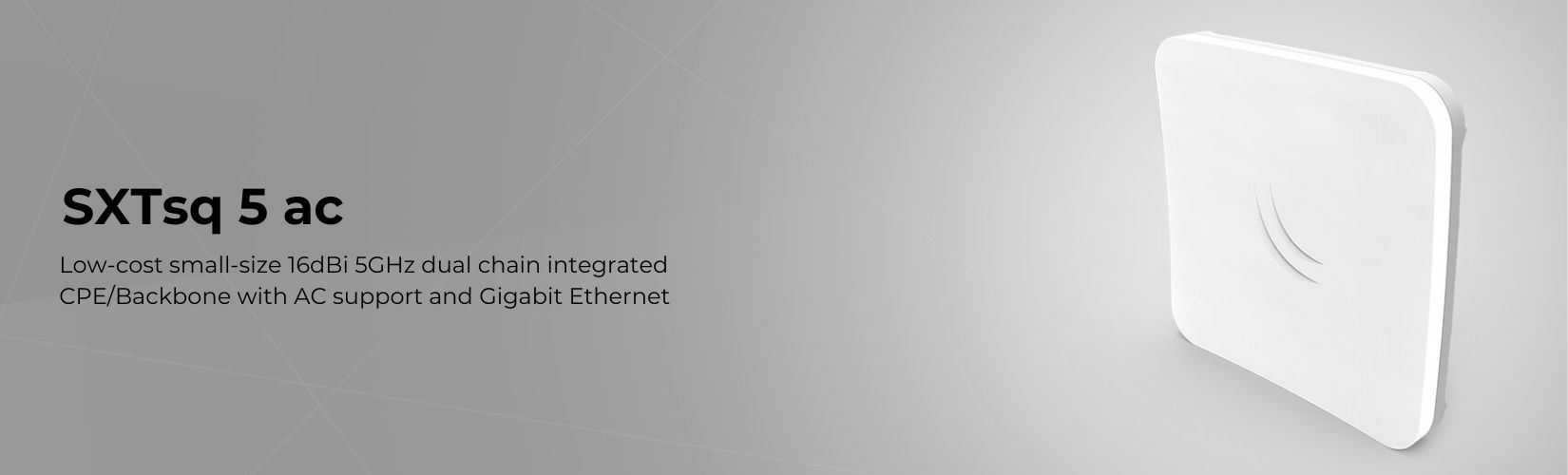 The SXTsq 5 ac retains a 16 dBi antenna like the SXT 5 ac, our previous model, yet the antenna design has been improved and the physical size has been dramatically reduced – the SXTsq is two times thinner.